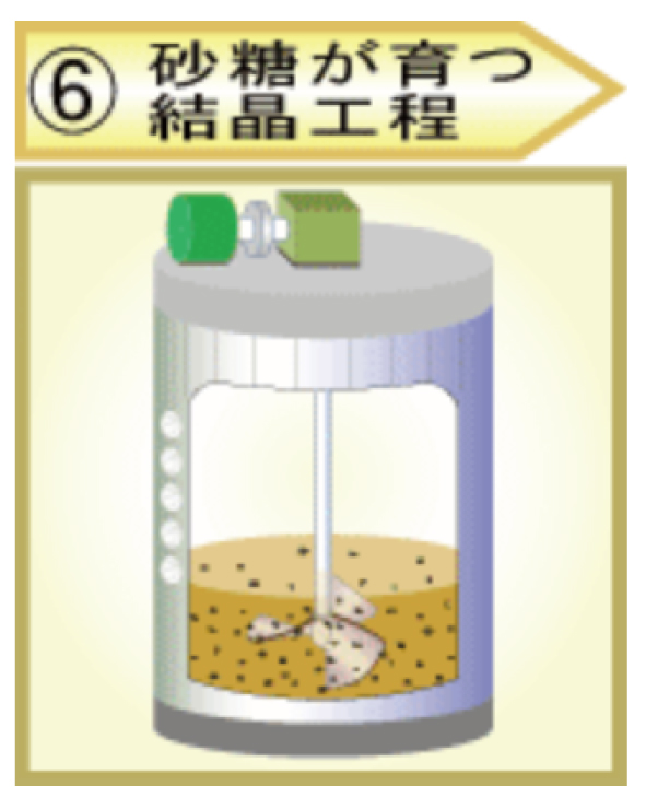 濃縮工程から送られたシラップは結晶缶の中に取り込まれ、結晶の成長に使われます。結晶の種を缶の中に入れるとシラップ中のショ糖分が結晶の種にくっつき、結晶が少しずつ大きくなります。結晶と糖蜜が混合した状態を白下(しろした)と呼び、結晶が十分に成長したら、この状態のまま結晶缶から分離機へ送られます。